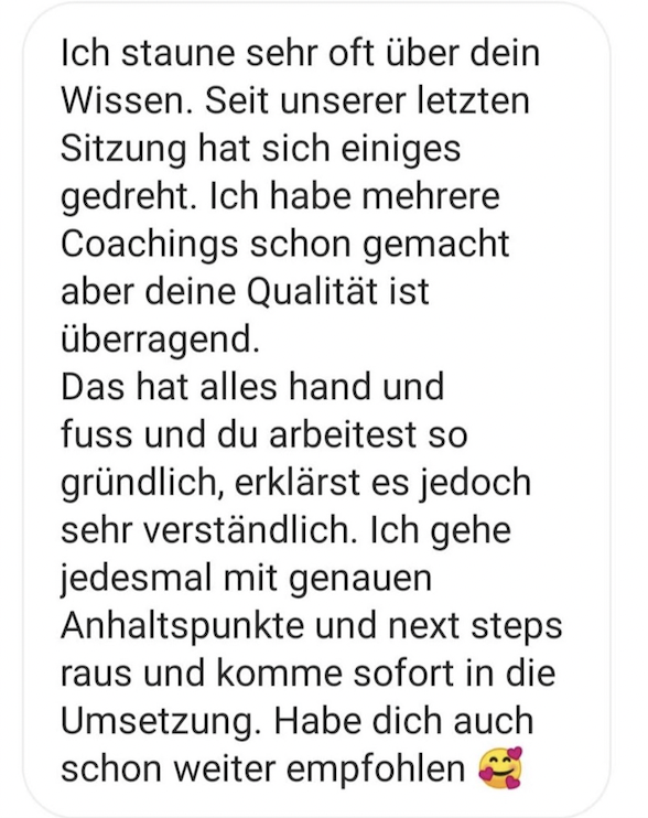 Du bekommst die besten Tools und psychologisch fundiertes Wissen, welches ich mir in 2 Coachingausbildungen und unzähligen Weiterbildungen angeeignet habe.